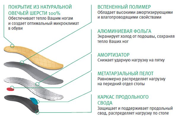 Главное отличие зимних стелек от обычных, это их теплое покрытие и дополнительный внутренний сорбирующий слой для сухости.